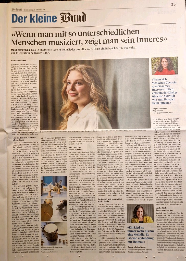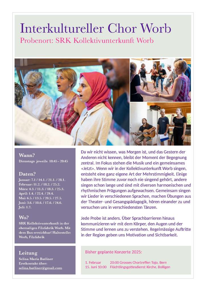 An den Proben und Konzerten des interkulturellen Chors nimmt eine sehr diverse Gruppe teil. Sie setzt sich aus Menschen aus der Kollektivunterkunft Worb, dem Rückkehrzentrum Enggistein, neu auch der Kollektivunterkunft Grosshöchstetten, sowie in der Region Worb Ortsansässigen zusammen. Wir singen Lieder aus verschiedenen Ländern, welche meist von Chormitgliedern selbst vorgeschlagen werden, Darunter Lieder in persischer, kurdischer, türkischer zazakischer, italienischer, deutscher, schweizerdeutschen und arabischer Sprache. 2024 konnten wir neben den wöchentlichen Chorproben auch etliche Auftritte in der Region Bern bestreiten und einen Chorausflug unternehmen. Geplant sind auch in diesem Jahr weiterhin wöchentliche Chorproben, Auftritte, einen Chorausflug und das Bewerben neuer Chormitglieder.